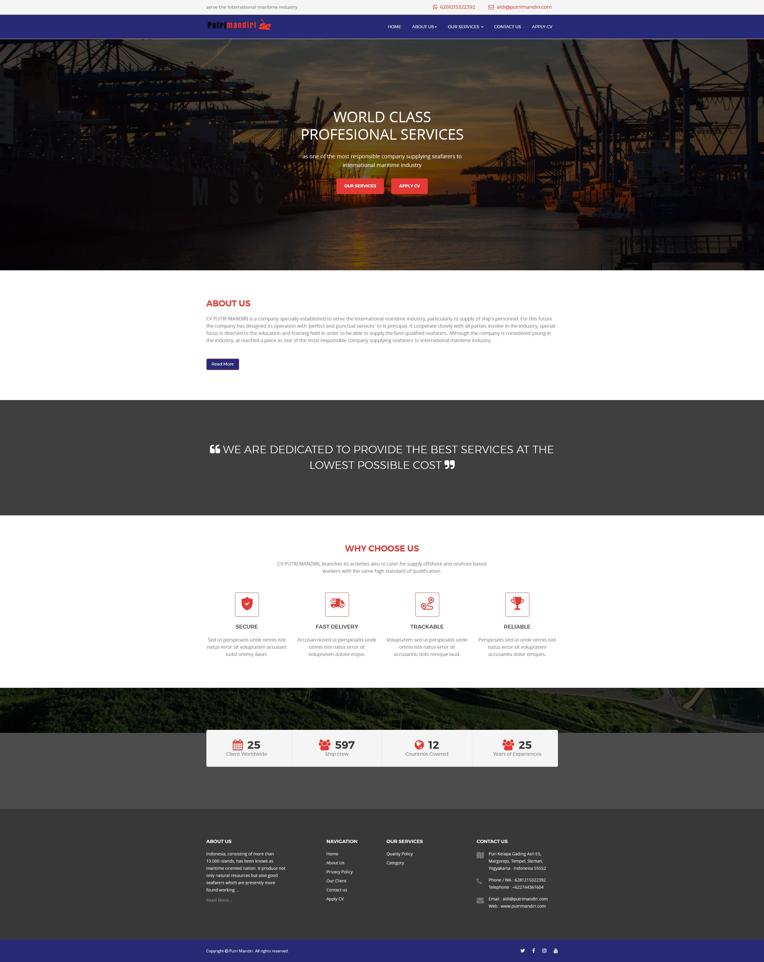 | Info | : | CV PUTRI MANDIRI is a company specially established to serve the International maritime industry, particularly to supply of ship's personnel. For this future the company has designed its operation with 'perfect and punctual services' to is principal. It cooperate closely with all parties involve in the industry, special focus is directed to the education and training field in order to be able to supply the best qualified seafarers. Although the company is considered young in the industry, at reached a place as one of the most responsible company supplying seafarers to international maritime industry. |
